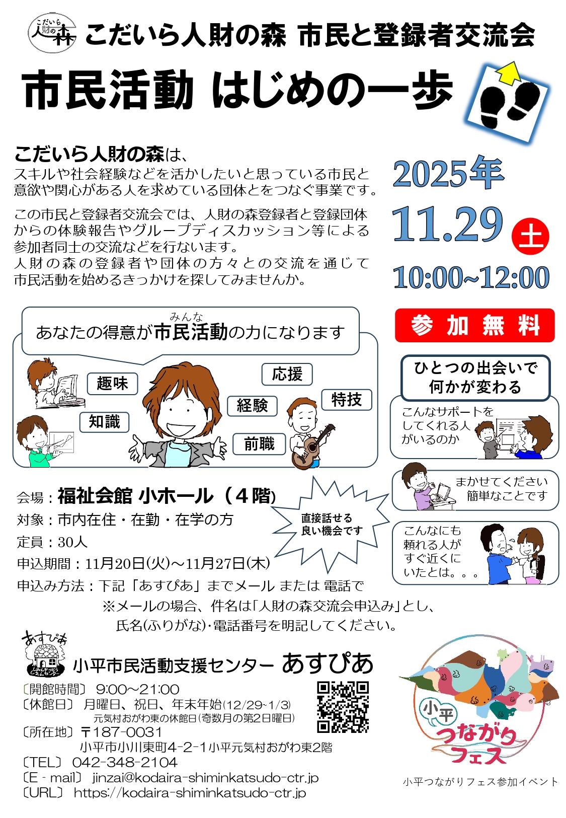 この市民と登録者交流会では、人財の森登録者と登録団体からの体験報告やグループディスカッション等による参加者同士の交流などを行ないます。 人財の森の登録者や団体の方々との交流を通じて市民活動を始めるきっかけを探してみませんか。 【定 員】30人(要申し込み・先着順、定員になり次第〆切) 【申込み】下記のあすぴあホームページをご覧ください。 https://kodaira-shiminkatsudo-ctr.jp/archives/30234