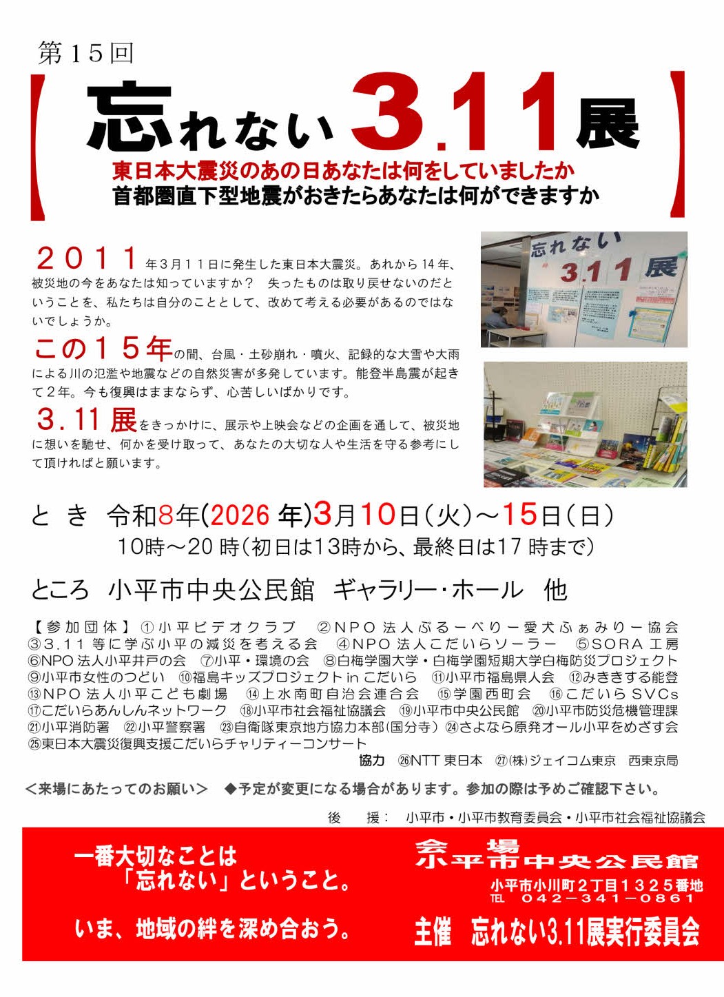 東日本大震災のあの日あなたは何をしていましたか 首都圏直下型地震がおきたらあなたは何ができますか 2011年3月11日に発生した東日本大震災。 あれから15年、被災地の今をあなたは知っていますか? 失ったものは取り戻せないのだということを、私たちは自分のこととして、 改めて考える必要があるのではないでしょうか。 この15年の間、台風・土砂崩れ・噴火、記録的な大雪や大雨による川の氾濫や 地震などの自然災害が多発しています。 能登半島地震が起きて2年。今も復興はままならず、心苦しいばかりです。 3.11展をきっかけに、展示や上映会などの企画を通して、被災地に想いを馳せ、 何かを受け取って、あなたの大切な人や生活を守る参考にして頂ければと願います。
