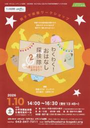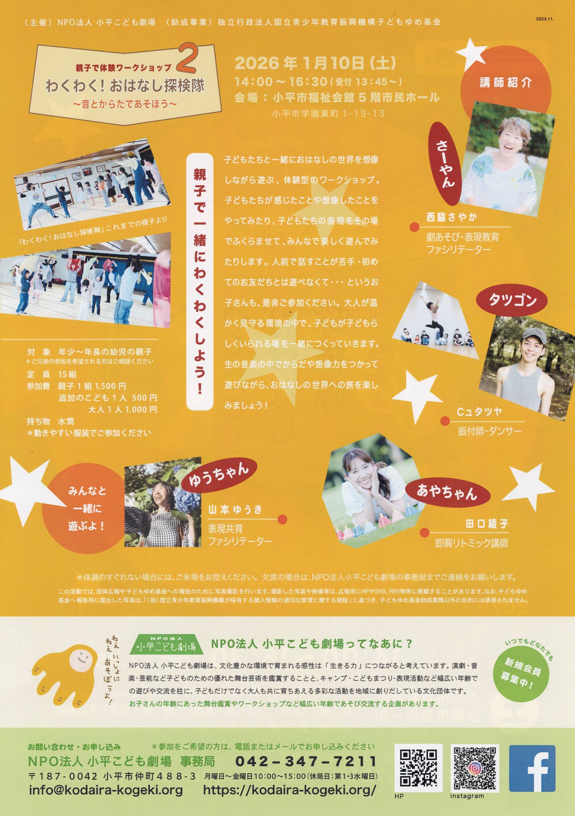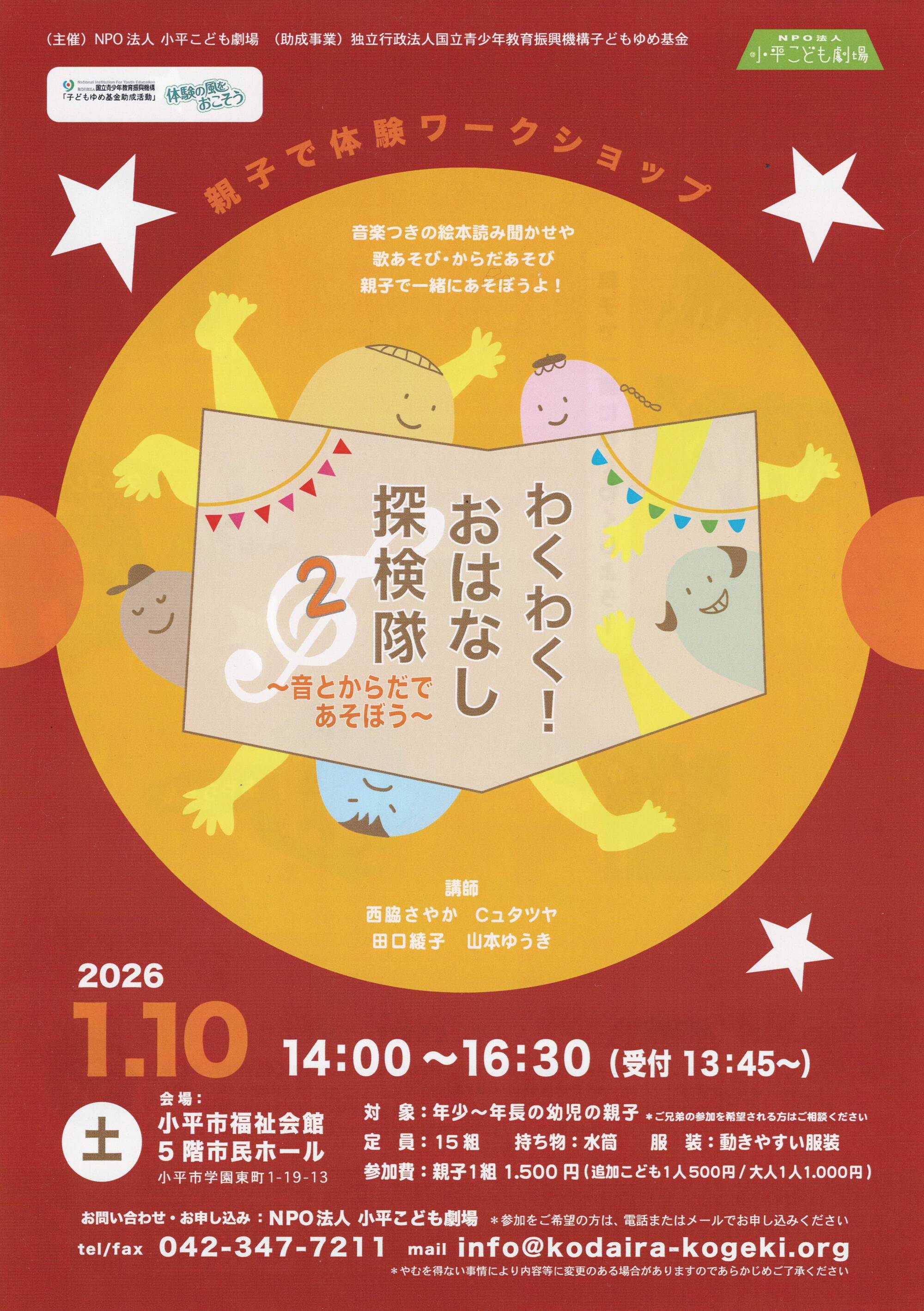 【日時】2026年1月10日(土)14:00-16:30(受付13:45〜) 【場所】小平市福祉会館 5階市民ホール 【対象】年少〜年長の親子 15組(要:事前申込、先着順) 【参加費】親子1組1,500円(追加こども1人500円/大人1人1,000円) 【申込】小平こども劇場事務局までお電話またはメールでお申し込みください。 TEL:042-347-7211 E-mail: info@kodaira-kogeki.org