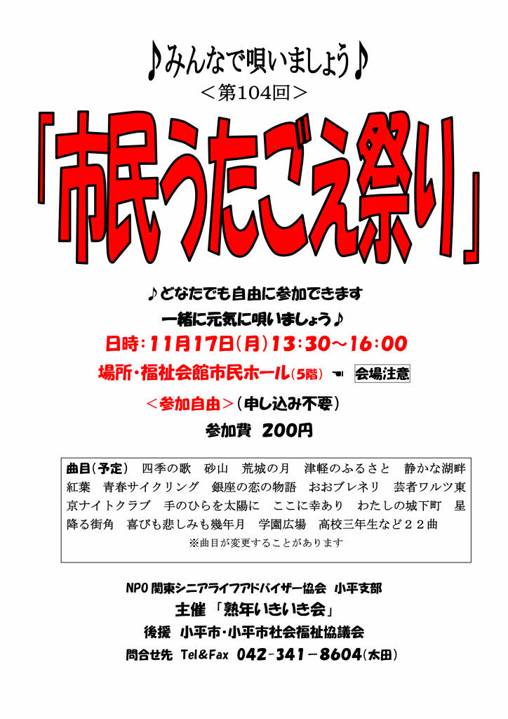 隔月には奇数月に市民うたごえ祭り、偶数月に伴侶を亡くした人が語り合う会を開催。随時、講演会開催。