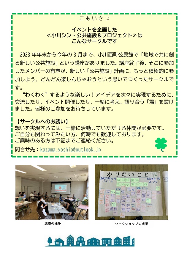 | 会員募集 | 想いを実現するには、一緒に活動していただける仲間が必要です。 小川駅西口開発『新公共施設』計画にもっと積極的に参加して、みんなで一緒に楽しんじゃおうと思う方、いつでも歓迎! ご興味のある方は下記までご連絡ください。 問合せ kazama.yoshio@outlook.jp |