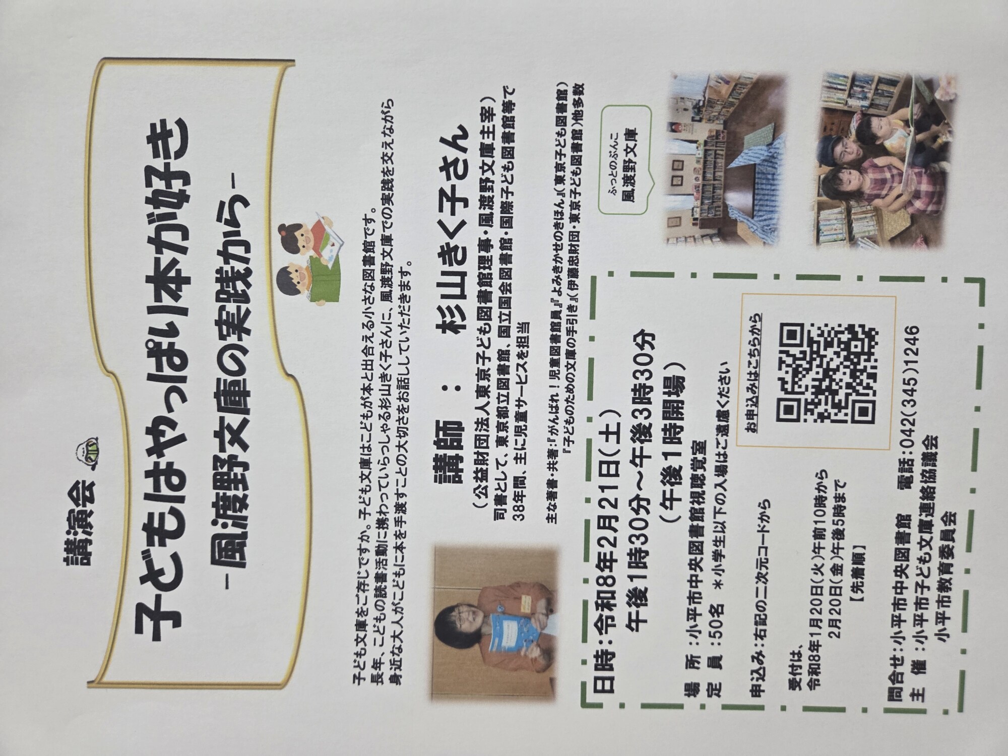 長年、こどもな読書に携わっていらっしゃる杉山きく子さんに、風渡野文庫での実践を交えながら身近な大人がこどもに本を手渡すことの大切さをお話ししていただきます。