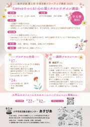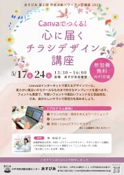 柔らかい風合いからクールなものまで好きなテンプレートを選べます。 フォントも豊富で、可愛いフォントや面白いフォントなど自由自在。 さあ、自分らしいチラシで発信力を高めましょう。 【日時】5月17日(土)、24日(土)13:30〜16:00 【場所】小平元気村おがわ東2階 あすぴあ会議室 【定員】16名(要申し込み・先着順、定員になり次第〆切) 【保育】ご相談ください。 【対象】2回続けて参加できる方 発信力があるチラシづくりに関心がある市民活動団体の方 日常的にメールやSNSの経験があり、PCやWord、Excelなどの基本的な操作ができる方 【費用】無料 【申込み】下記のあすぴあホームページからお申込みください。 https://kodaira-shiminkatsudo-ctr.jp/archives/28723 【申込み期間】4月22日(火)〜5月12日(月) 【問合せ先】小平市民活動支援センターあすぴあ TEL 042-348-2104 メール event@kodaira-shiminkatsudo-ctr.jp
