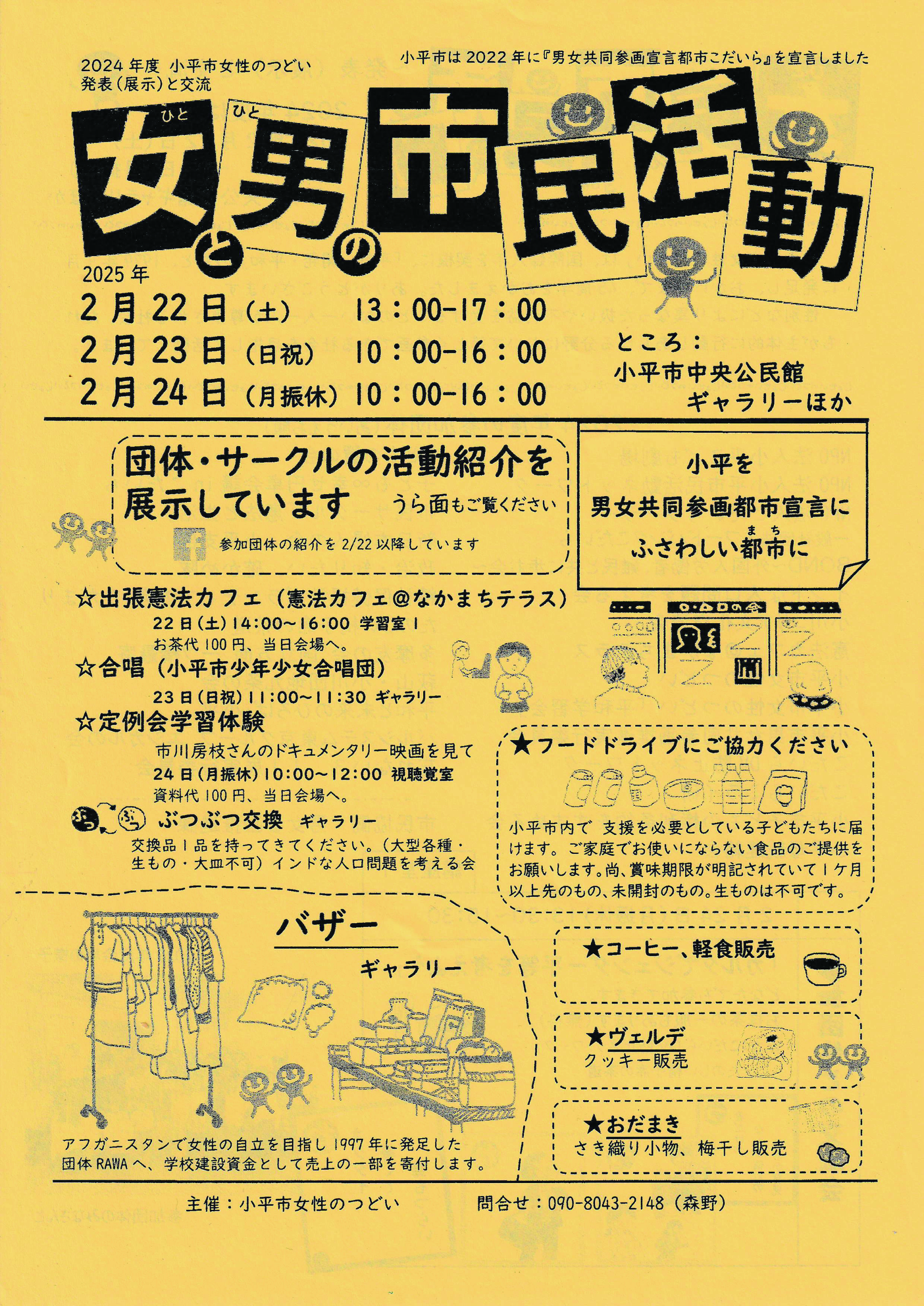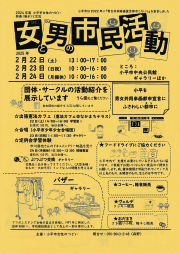 2/22(土) 13:00-17:00 2/23(日・祝) 10:00-16:00 2/24(月・振休)10:00-16:00 13:30ー参加団体交流会(講座室1)