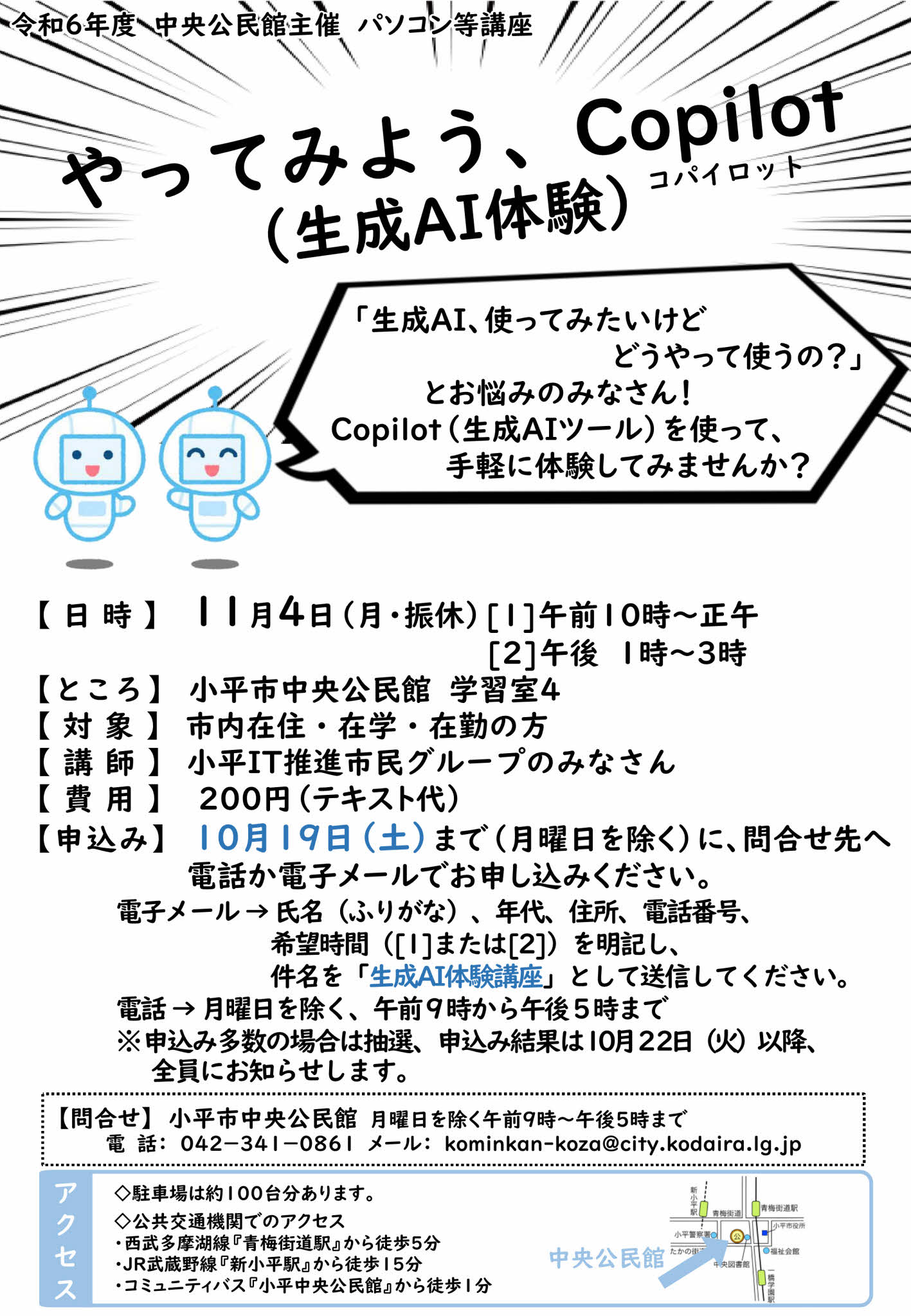 中央公民館で「やってみよう、Copilot(生成AI体験)」の講座が開催されます。