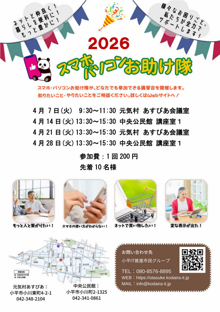 参加者へ個別に対応します。入退室は自由です。 ■参加費: 200円 ■持 参: スマホ、パソコン(電源、マウス) ■定 員: 先着10名 ■申込み: 不要 ■ホームページ: https://otasuke.kodaira-it.jp